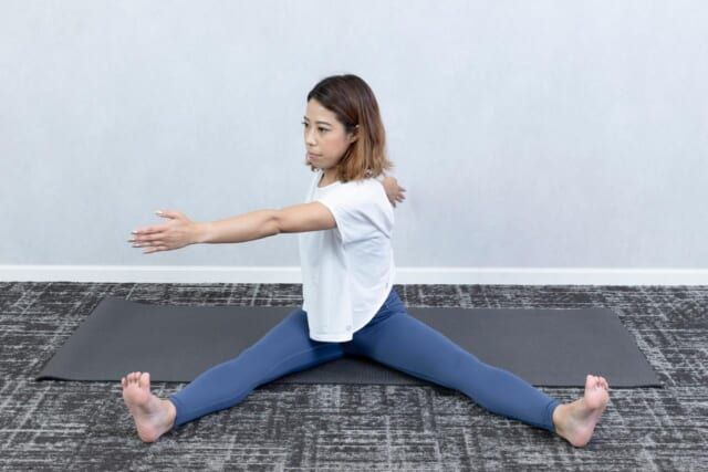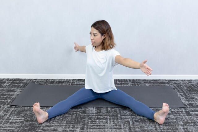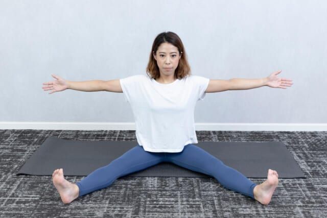 (1)しっかりと骨盤を立てて両脚を開き、両腕を真横に大きく広げる