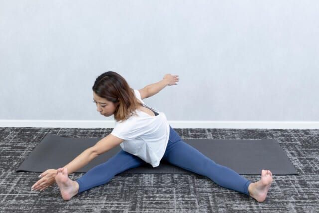 (3)体をねじりきったら左手を右脚の外側に置いてゆっくりと上半身を前に倒し、そのままさらに左手をノコギリのように前後させて前屈を3回繰り返す