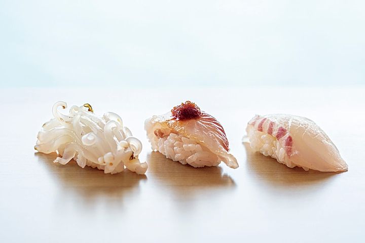 地元の旬の魚介を中心に提供する6席の鮨カウンターも。 Hearst Owned