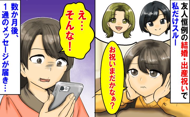 「今まで1万5千円出したのに…」友人恒例の結婚・出産祝いで私だけスルー。数カ月後、1通のメッセージが届き