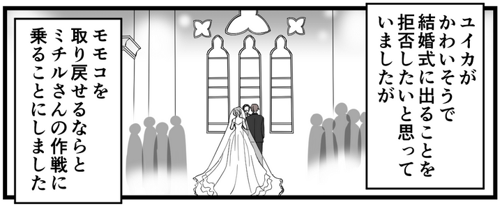 ジュンセイさんの両親とお姉さんは、私たちの味方をすると言ってくれました。私たちは「任せてください」というジュンセイさんのお姉さんを信じるしかなく……結婚式の当日を迎えたのです。