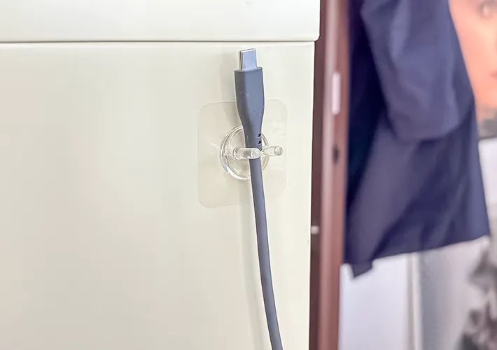 そこで、『歯ブラシホルダー』をデスクの側面や棚の内側に貼りつけておけば、ケーブル類を引っ掛けておくことができます。