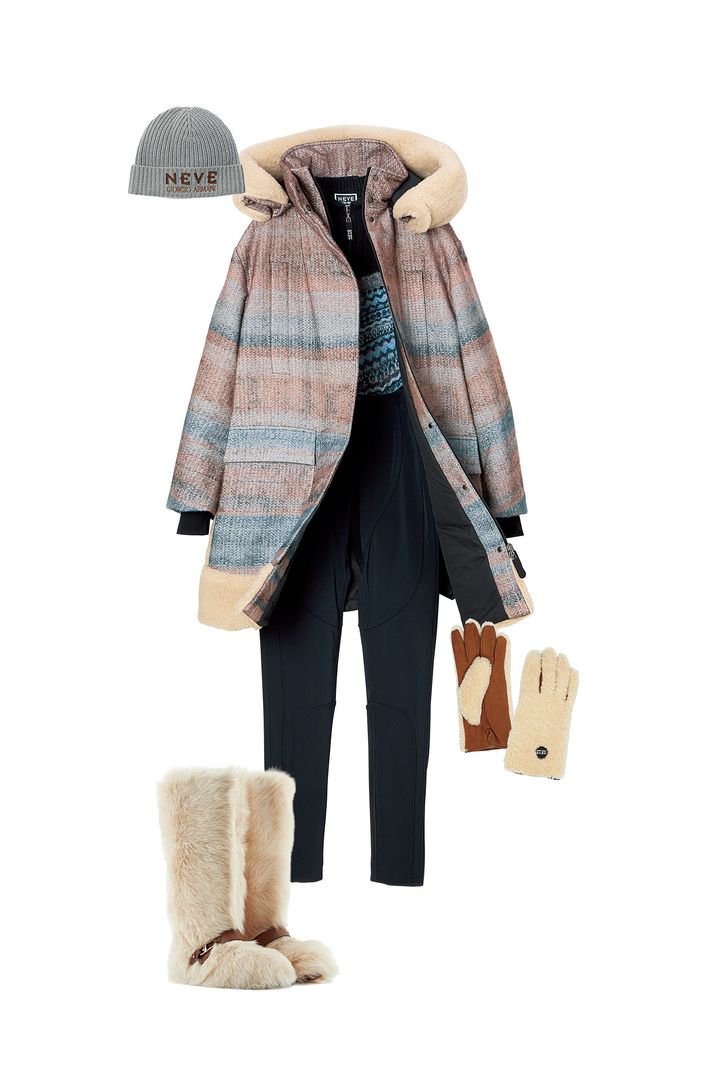 毎年、ウィンターリゾートのためのカプセルコレクション“ネーヴェ”を発表するジョルジオ アルマーニ。50周年を迎えた今年は、 海外リゾートでも映えそうなアーティスティックなマルチカラーのコートが登場。コートのボアとリンクした、ぬくもり小物で甘さをプラス。