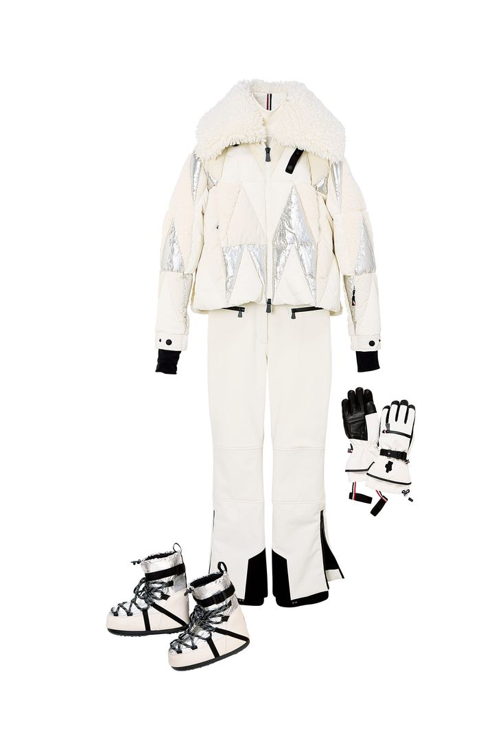 スノースポーツ好きの憧れ、白のウエア。モンクレール グルノーブルの新作は、ダウンジャケットにあしらったメタリックシルバーの幾何学柄がアクセント。ふわもこの襟も、顔まわりを華やかに見せてくれます。ウエアと小物にスパイス的に効かせた黒が、全身をシャープに引き締めて。