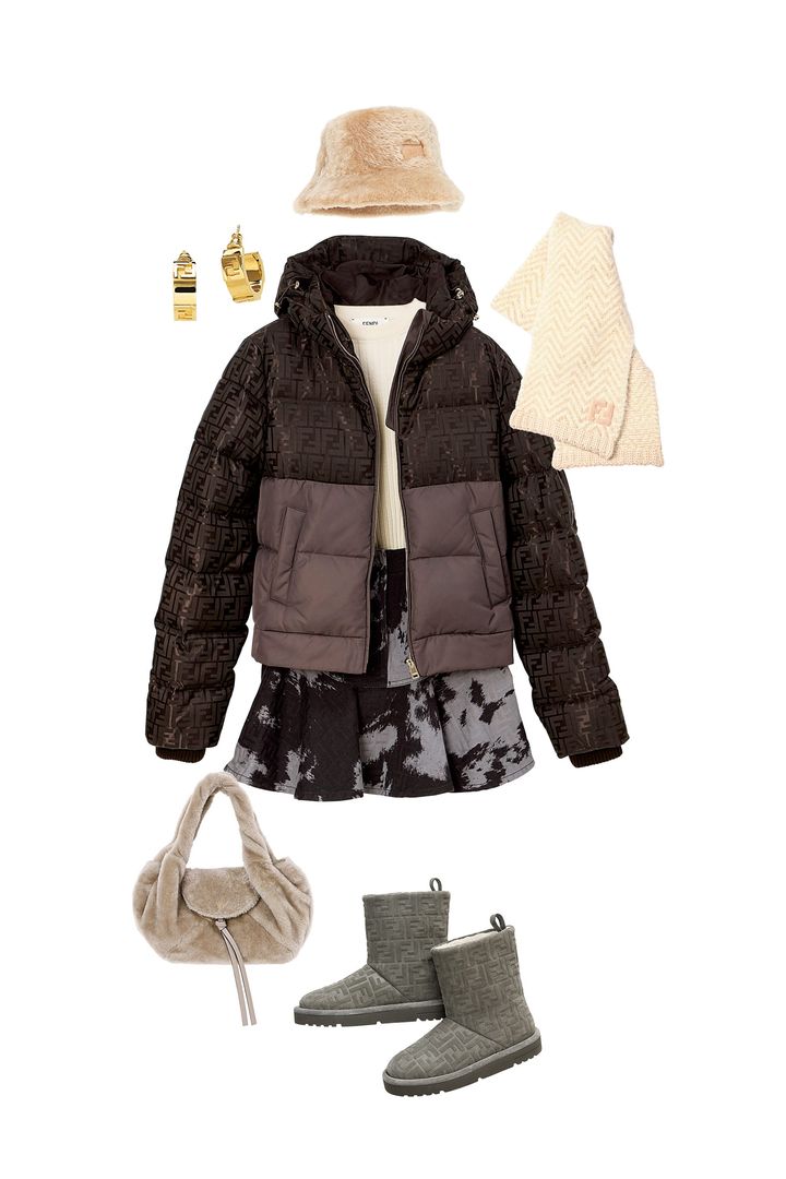 ジャケット¥473,000 プルオーバー¥168,300 スカート¥179,300 バッグ¥631,400 靴¥162,800 帽子¥236,500 マフラー¥107,800 ピアス¥67,100(すべてフェンディ/フェンディ ジャパン)