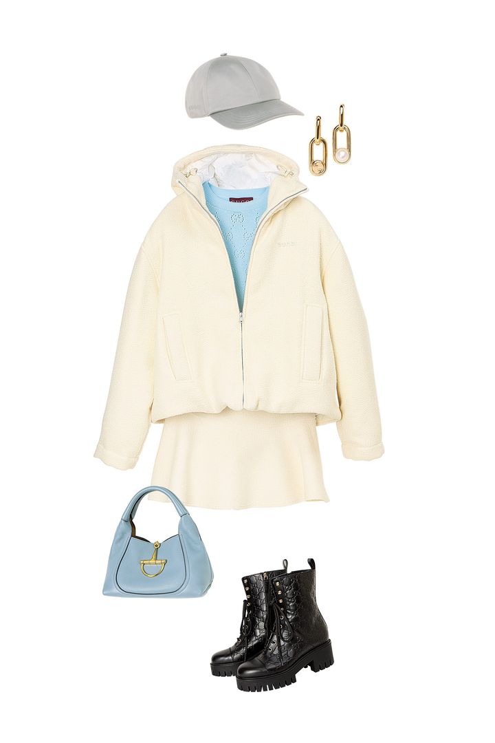雪景色に包まれたホテルやレストランでは、ぬくもりのあるウールブークレ地のフーディと、お揃いのフレアミニのスカートでスイートに。プルオーバーとバッグの水色を差し色にすれば、ちょこっとトラッドなエレスポ・スタイルが完成。