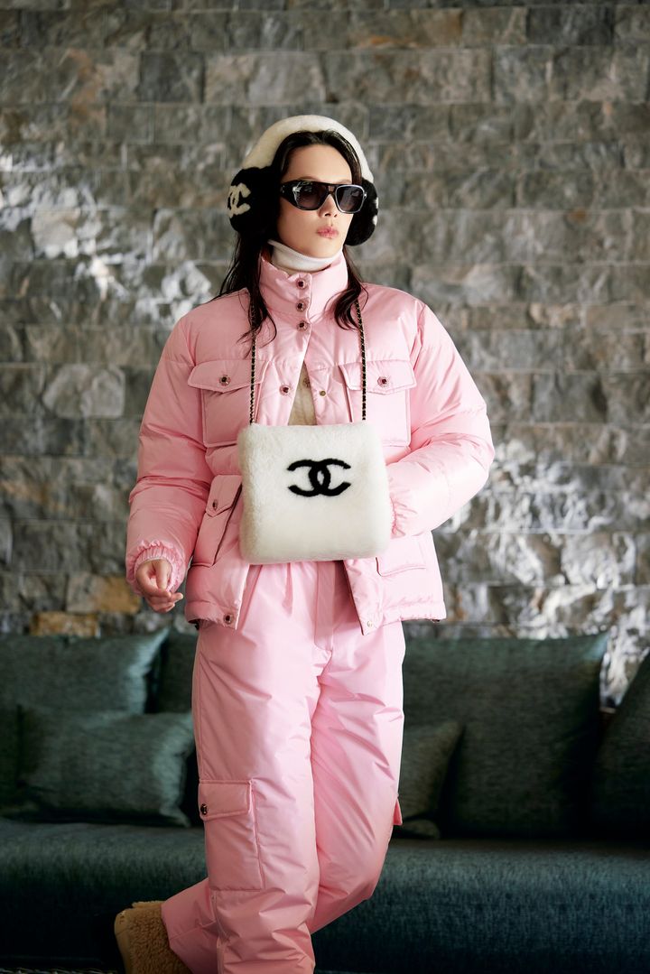 シャネルならではのパウダリーな甘ピンクのウエアに、ダブルCのロゴ小物をスタイリング。スポーティな場面でも、上品な可愛らしさが漂うスタイルに。