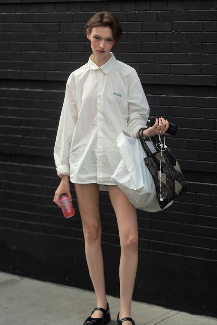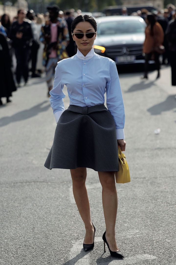 ディオールDIOR)のショー会場に姿を見せたアニャ・テイラー = ジョイは、クロップド丈のタキシードシャツに、台形シルエットを強調させたミニスカートを着用。多くのルックが共通して素足にブラックのピンヒールを合わせ、足もとはとことんミニマルにスタイリングしていた。シャツ以外のアイテムで変則的なシルエットを取り入れたり、スパイスになる小物をプラスしたりと、シャツが新鮮に映る組み合わせにトライしてみてほしい。