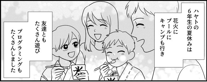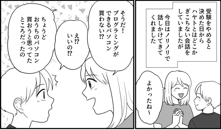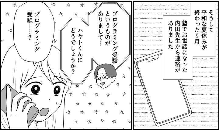 するとハヤトの目はみるみる輝きを取り戻していきました。今は勉強のことよりも好きなことをして過ごしてほしい……そう思って夏休みを過ごすと、内田先生から「プログラミング受験」という言葉を聞くことになるのでした。