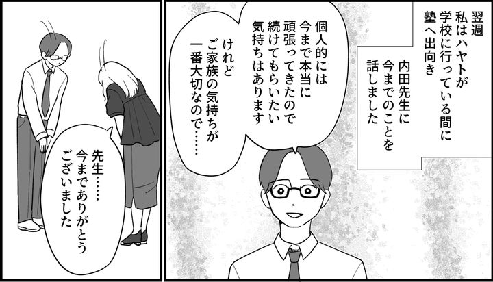 翌週、私はハヤトが学校に行っている間に塾に行き、内田先生に警察のこと、お金のこと、自分たちがいかに至らなかったことなどを話しました。こうして私たちは塾もやめました。