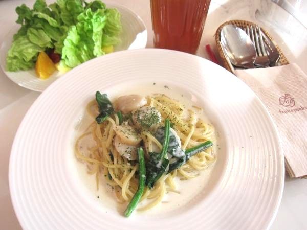 帆立とほうれん草のクリームソースのパスタセットを頼みました。大きな帆立が入って、濃厚クリームソースで美味しい~。