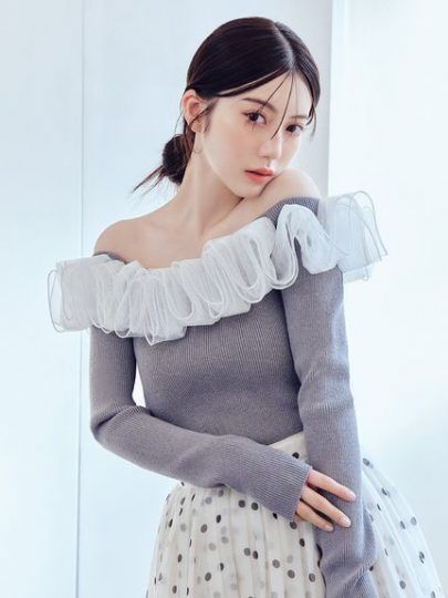 オフショルダーのリブニットプルオーバーに、チュールフリルで華やかなアクセントをON。フリルは先端部分にテグスを仕込んで、ランダムな動きとボリューム感を表現します。今シーズンは、ハイウエストパンツなどを合わせたさっぱり大人っぽいスタイリングがおすすめです。
