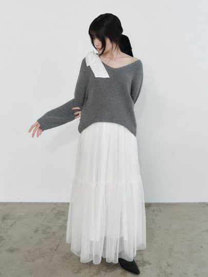 今すぐ着たいざっくりニットとチュールスカートのセットアイテム。大きなリボンがコーデを華やかにしてくれるニットは、右肩のさりげない開きで上品な肌見せが叶います。