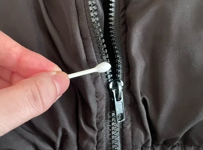 筆者は、綿棒でリップクリームを軽くなでて、ファスナーに塗ってみました。