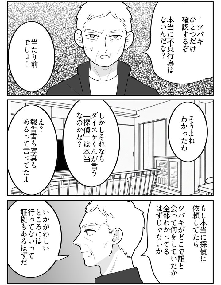 子どもたちを連れて実家に向かった私。これまでの経緯を打ち明けると、両親は真剣な顔をして聞いてくれました。そして父は、ダイスケの主張に不自然な点があることや、ダイスケの言い分が矛盾していることを指摘しました。