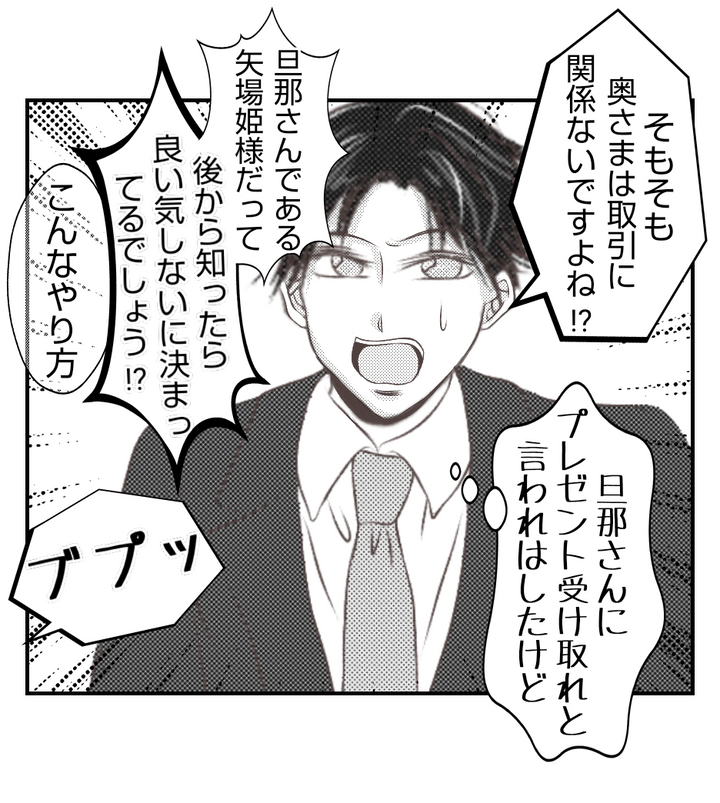 純がプレゼントを持って取引先に返しに行ったことを知った上司は「勝手するんじゃない」と激怒する。