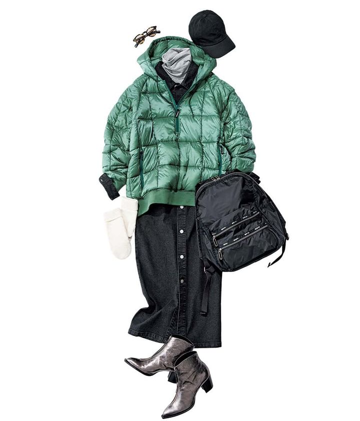 アノラック¥39,600(ワイルドシングス × シンゾーン/シンゾーン ルミネ有楽町店)デニムワンピース¥44,000(ウィム ガゼット/ウィム ガゼット 玉川髙島屋S・C店)タートルネックカットソー¥20,900(オットダム/パサージュ ドゥ ストックマン 恵比寿店)バックパック¥29,700(レスポートサック/レスポートサック カスタマーサービス)ブーツ¥44,000(銀座かねまつ/銀座かねまつ6丁目本店)サングラス¥47,300(アイヴァン/アイヴァン 東京ギャラリー)キャップ¥7,700(アストラット/アストラット 新宿店)ニットミトン¥1,990(ユニクロ)