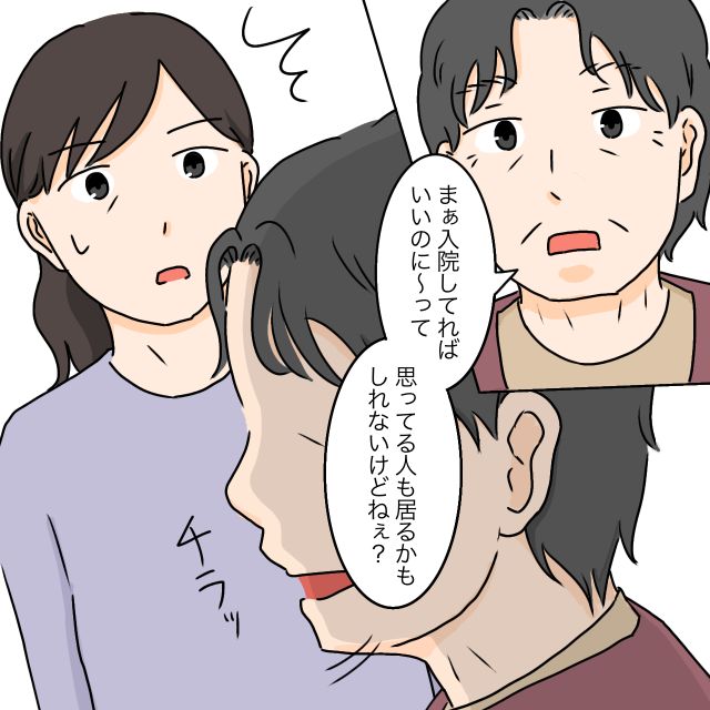 幸い軽いケガで済んでよかったと言う義祖母は「まぁ、入院してればいいのに~って思ってる人もいるかもしれないけどねぇ?」と義母をチラリと横目で見ながらさっそく嫌味を言い始めました。元気な証拠。でもこんな時にまで義母に喧嘩を仕掛けなくてもいいのに・・・ハラハラしながらそばで見ていると