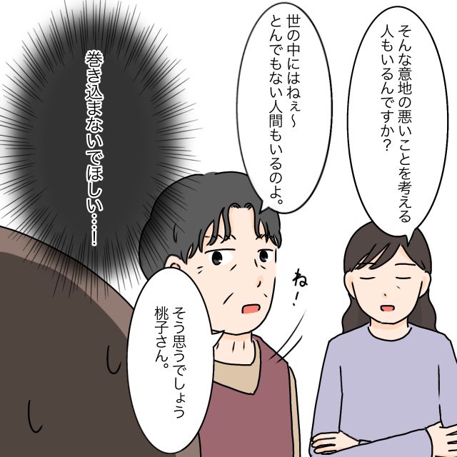 義母も素知らぬ顔で「そんな意地の悪いことを考える人もいるんですか?」と言い返しました。やっぱり似た者同士。そう心の中で思っていると、「ね、そう思うでしょう桃子さん。」と義祖母に突然話を振られて焦りました。小競り合いに巻き込まないでほしい。うっかりリアクションするとどちらかの見方をしているように見えてもいけないので、困惑しながら無言でいるしかありませんでした。