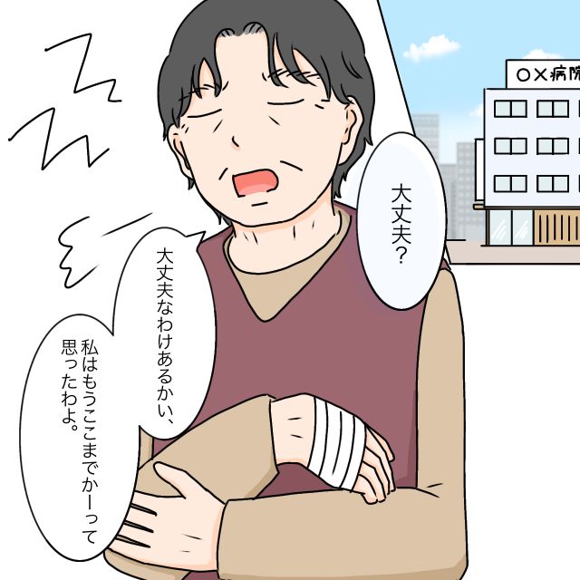 病院へ着くと、手をケガした義祖母に「大丈夫?」と声をかけると、「大丈夫なわけあるかい」と不機嫌そうに「私はもうここまでかって思ったわよ」と文句を言っていました。