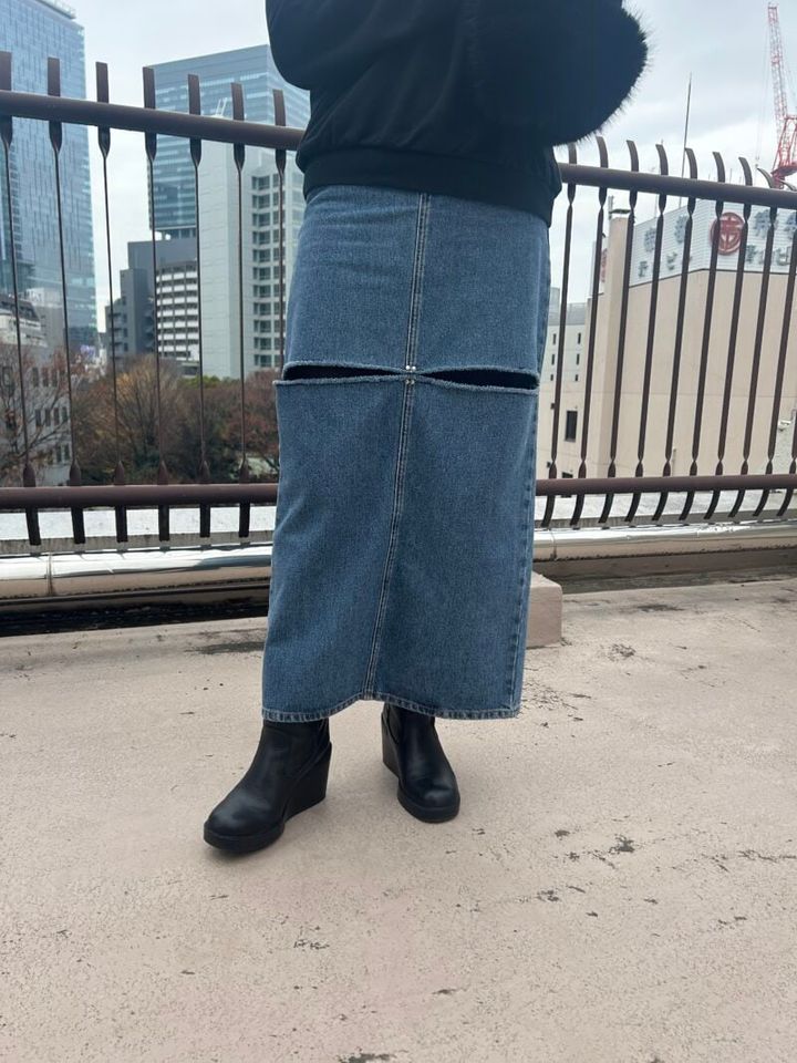 スウェットにデザイン性の高いデニムスカートをあわせた、カジュアル要素の高い着こなし。スウェットは、黒地にワンポイントが入っているシンプルなデザインを選び、ほかのアイテムもブラックで統一していることでスタイリッシュにまとまります。ファーバッグや厚底のブーツなど、キャッチーなアイテムを入れ、遊びも感じる上級コーディネイトです。
