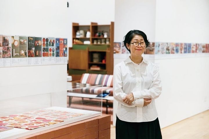 〈写真〉「シミド ソファ」2シーター W150×D75/85×H79㎝ ¥385,000(D75)、¥418,000(D85)。背景にある7色+ソファの張り地に使っている色の全8色がスタンダードカラーとしてラインナップ。リサイクルされたコットンとペットボトルを素材に用いたアップサイクルな生地だ。