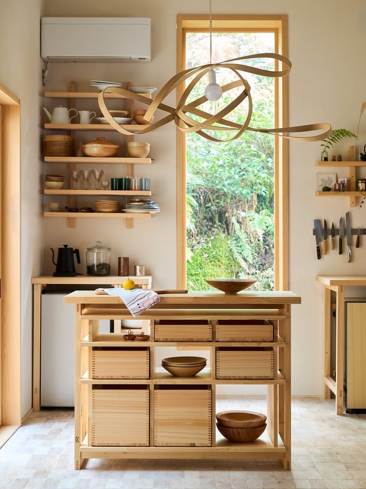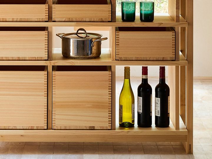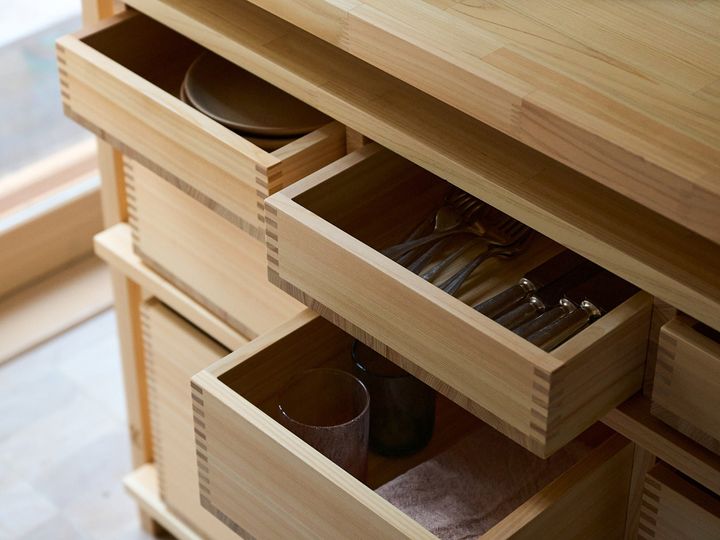 棚、引き出しともに、素材には吉野ヒノキの無垢材を採用。自然の温もりを感じさせる素朴な表情ながら、高い耐久性と強度を保持し、調湿性にも優れているため、日本のキッチンにはまさに最適な素材だと言える。さらにフィリックスは、従来の製材における規格サイズを再計算。歩留まりがよく、極力無駄のない寸法を割り出し、この「アイランド」のボリュームに生かしているというのもポイントだろう。