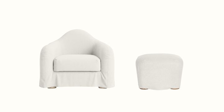 〈写真・右〉オットマン W50×D50×H38㎝ ¥165,000 〈左〉アームチェア W85×D75/85×H79㎝ ¥319,000(D75㎝)、¥341,000(D85㎝)