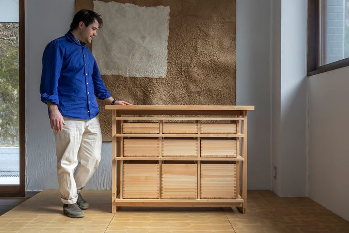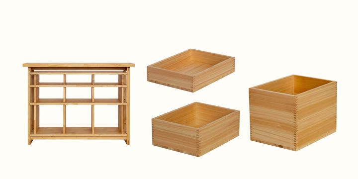 〈写真〉日本酒を入れる桝をつくっている会社とコラボレーションして制作した引き出しは、収納ボックスとして単品で使っても。アイランドと天板のわずかな隙間にはサランラップやアルミホイルなどの細かなキッチン用品をしまえるよう計算されている。「アイランド 2」〈左〉W120×D45×H88㎝ ¥242,000 「スモールドロー」〈中央・上〉W29×D38×H86㎝ ¥16,500 「ミディアムドロー」〈中央・下〉W29×D38×H14.6㎝ ¥27,500 「ラージドロー」〈右〉W29×D38×H28.8㎝ ¥33,000