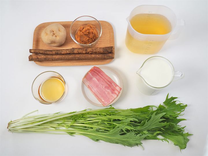 4. 3の鍋にごぼうとベーコンを入れて1~2 分煮る。牛乳を加えて煮立たせないように温めて、みそを溶き入れる。