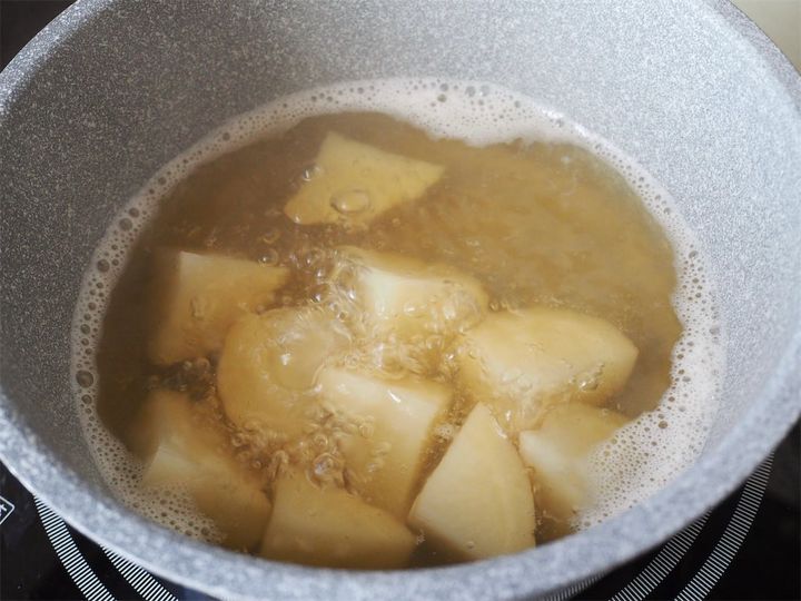 3. 鍋にだし汁とじゃがいもを入れて、4~5分ほど煮る。