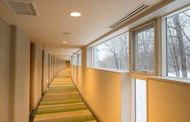 4階建ての低層の建物は日本を代表する建築家の黒川紀章の設計で、上空から見ると大沼に飛来する白鳥が翼を広げた外観デザインです。東西に広がる翼に相当する箇所が客室になっていて、廊下がカーブを描くとともに、窓からは外光が入り込み、森の木立を横目に客室へと向かいます。