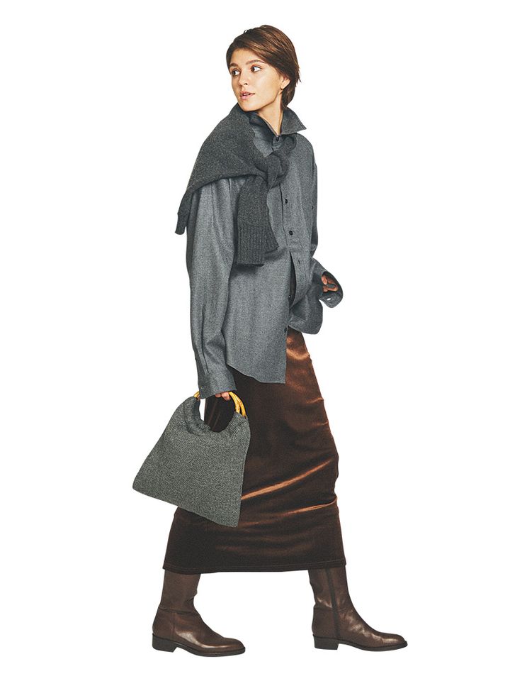 【POINT】ドライなシャツにレディな華やぎを足せるしっとりとした微光沢。同色のロングブーツをつなぎ、動きやすくともすらりとした見た目は保持。