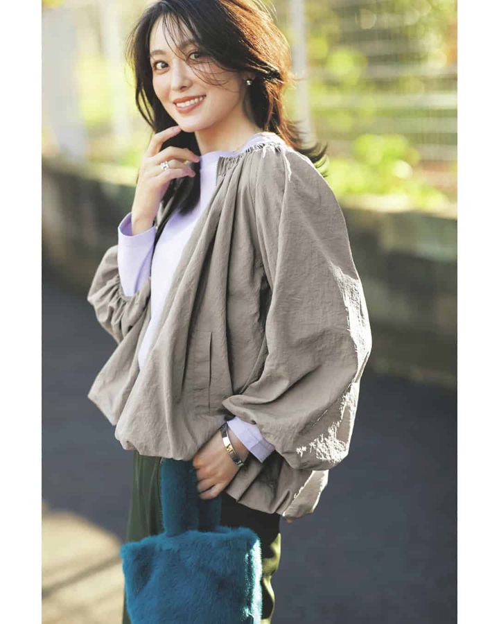 袖口と、裾がバルーンになったブルゾンは、撥水素材を使用。裏地は軽やかなメッシュ素材なので、初夏まで涼しく着られます。1枚でブラウスのように着ることもでき、着こなしの幅が広がります。