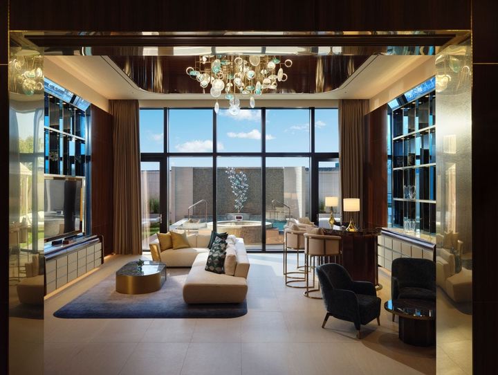 サンタワーで最も広い「インスパイア・スイート」は、広さ約131㎡。リビングにはバーカウンターやダイニングテーブル、ミニキッチンも備えている。 INSPIRE Entertainment Resort