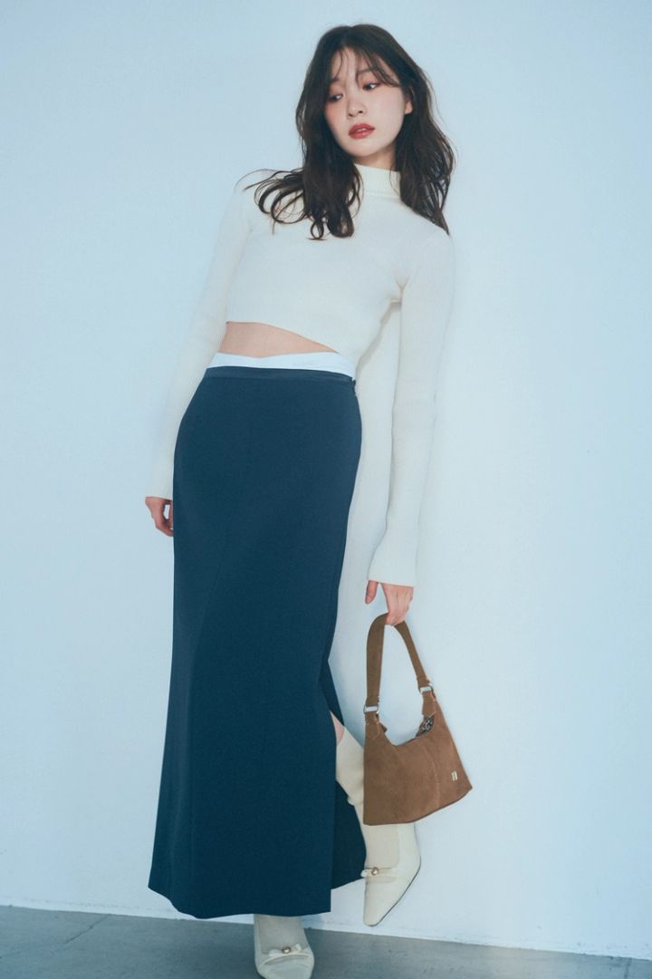 王道タートルネックと肌見せのいいとこ取りニットで、女の子の武器を最大限に発揮♡ 小物はシンプルな物を選ぶのが◎。