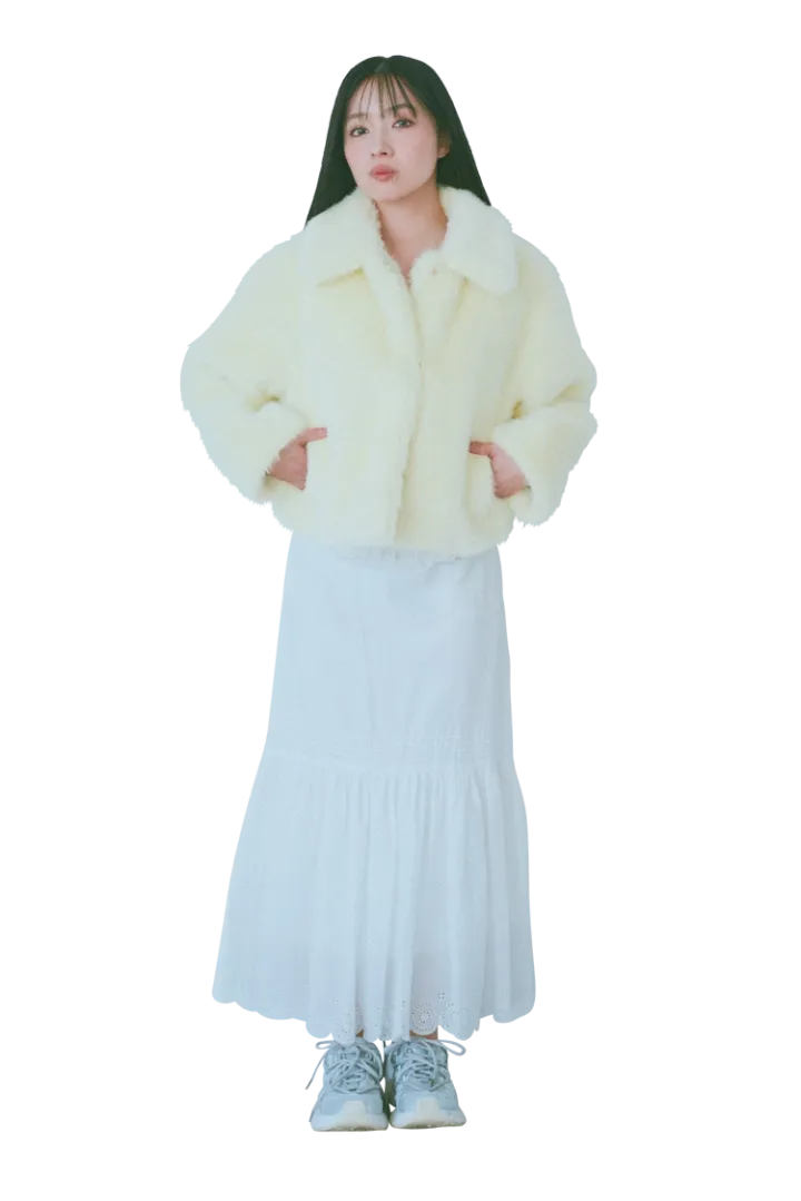 ファージャケット 16,500円/PEACH JOHN スカート 19,800円 /DEICY スニーカー 4,950円/SPINNS