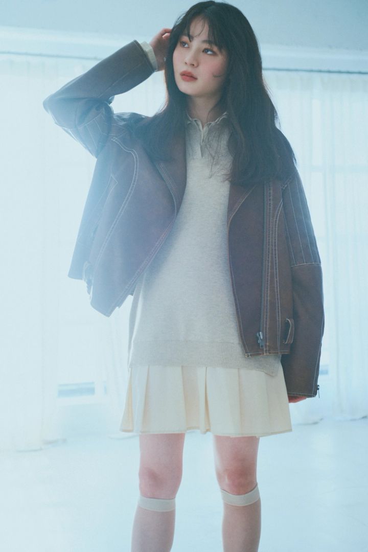 レザージャケット 19,800円/LAGUA GEM(バロックジャパンリミテッド) シャツドッキングワンピース 14,300円/dazzlin シアーソックス/スタイリスト私物