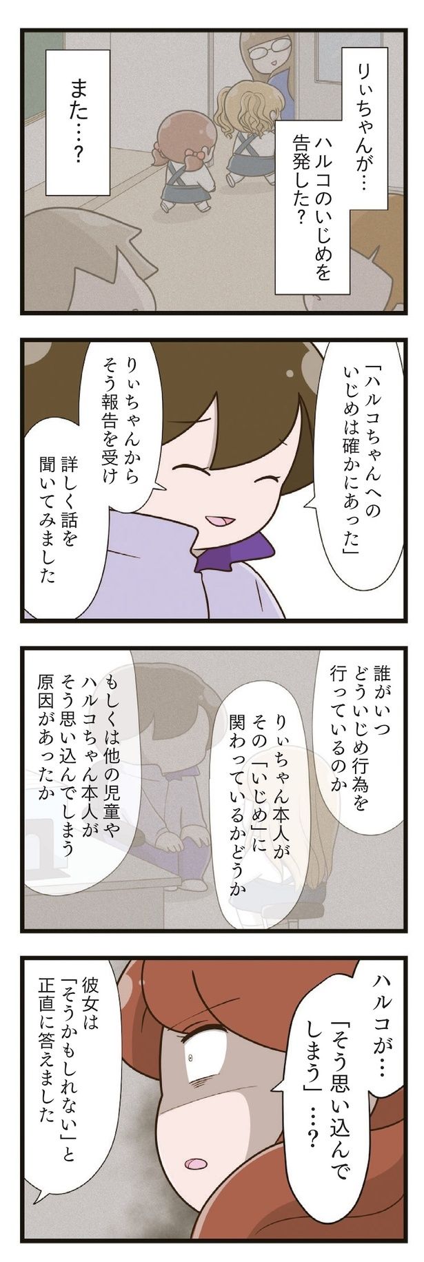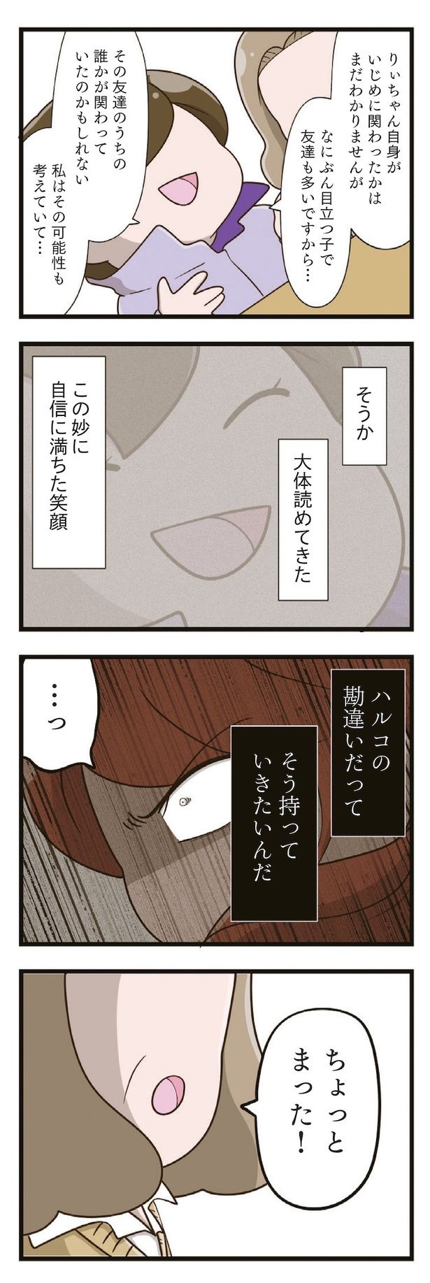 「お姉ちゃん学校でいじめられているんだって」息子の一言がきっかけで、母親は娘・ハルコの言動に違和感を抱くようになる。その結果分かったのは、ハルコが4年間、ひとりでいじめに耐えて隠し続けていたこと。いじめの本当の加害者は、被害者は誰? いじめと向き合う家族が希望を取り戻すまでの物語『家族全員でいじめと戦うということ。』を再連載でお届けします。いじめの原因になった同級生を描く新作『「お母さんの言うとおり」にしてきたのに 家族全員でいじめと戦うということ。 サキコの場合』も好評発売中です。