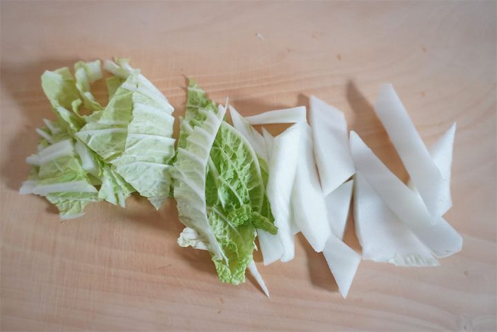 1. 白菜は葉と軸に切り分けて縦3等分に切り、2cm幅の斜め切りにする。餅は5mm厚さに切って1cm幅に切る。サバ缶は汁気を切る。