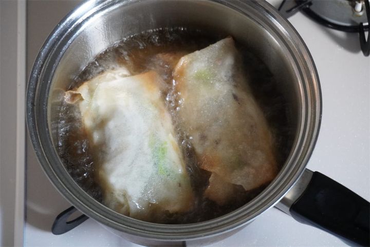 春巻きが重くて鍋の底についてしまう場合は、網じゃくしを下に入れて持ち上げた状態で揚げるとよいそうです。