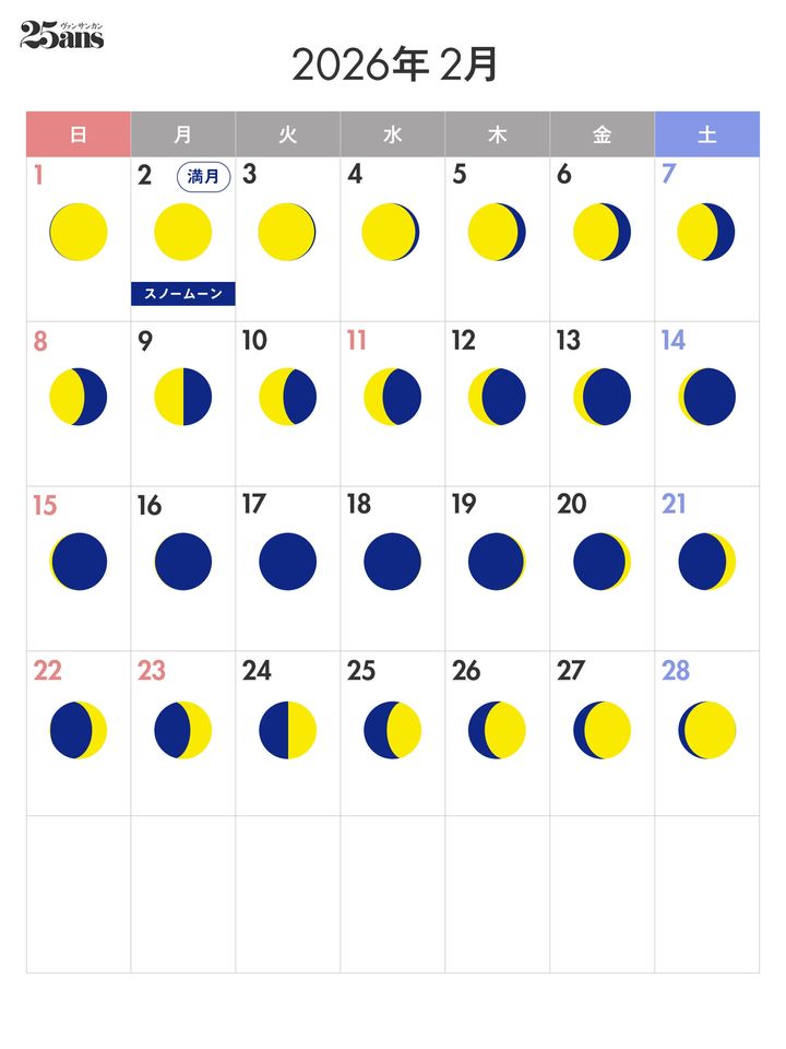 2026年2月の満月は、2月2日の7時9分頃に最大を迎えます。北半球では1年で最も雪が積もる寒い季節であることから「スノームーン」と呼ばれて親しまれています。冬の澄んだ空気の中で、満月や星空がくっきりと明るく見られそうです。しっかり防寒対策をして、夜空を眺めてみましょう。