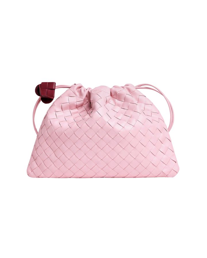 スタイリングの甘いワンポイントにピンクのバッグを。イントレチャートのハートチャームは取り外し可能。