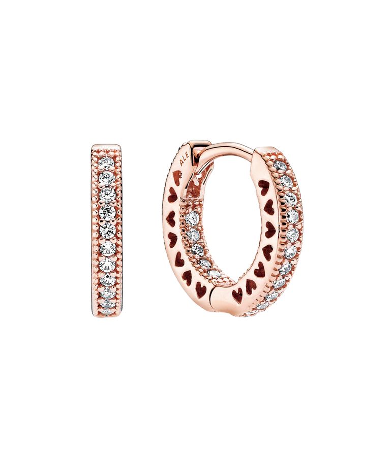 フープの内側と外側の両方にキュービックジルコニア、側面にハートのカットアウトが並ぶ、三方良しなデザイン。