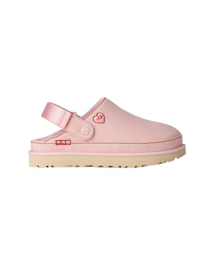 ピンクのクロッグにハートの刺しゅうをあしらい、足元に愛らしいアクセントを添える。