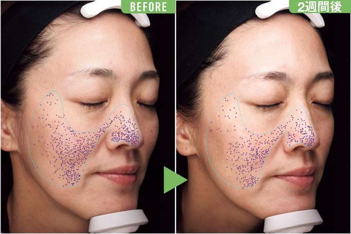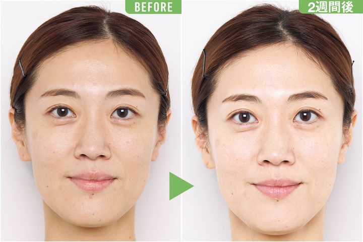 チークトップの位置がアップし、若々しい印象に。SK-II推奨の「フックマッサージ」を朝晩行い肌への浸透を深めた様子。VISIAでは毛穴、キメ、ポルフィリンのスコアが改善し肌全層の環境が改善した結果が表れました。