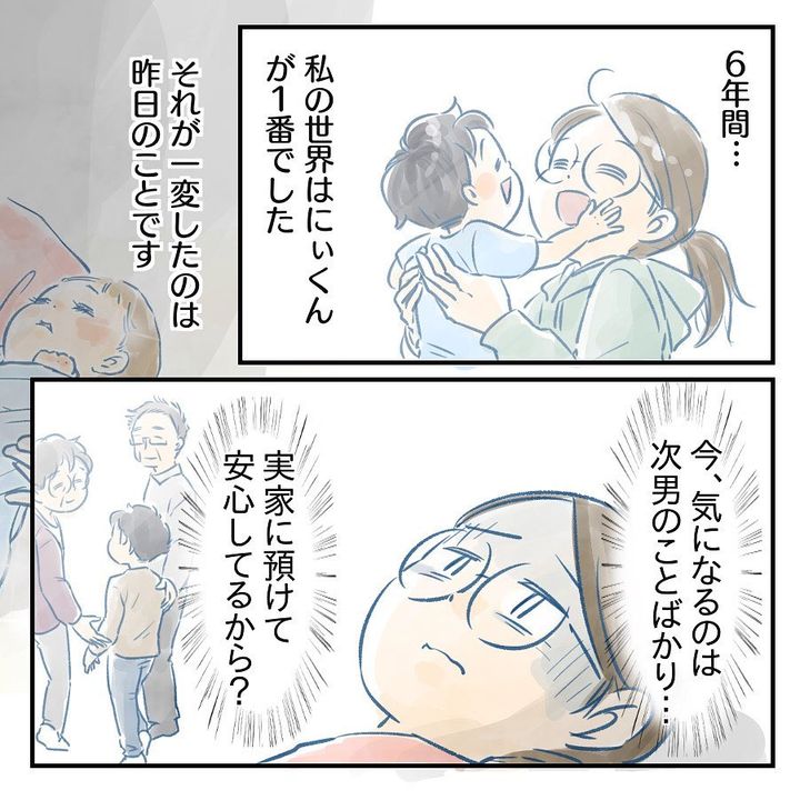 星田つまみさんが第2子出産時に経験した“夫婦間の危機”を漫画化。お隣さんは旦那さんがずっと付き添っていて「羨ましい」と感じたつまみさん。ふと「長男は何をしているかな?」と思ったが、それまで丸一日、長男の存在を忘れていたことに気付き、落ち込んでしまう。