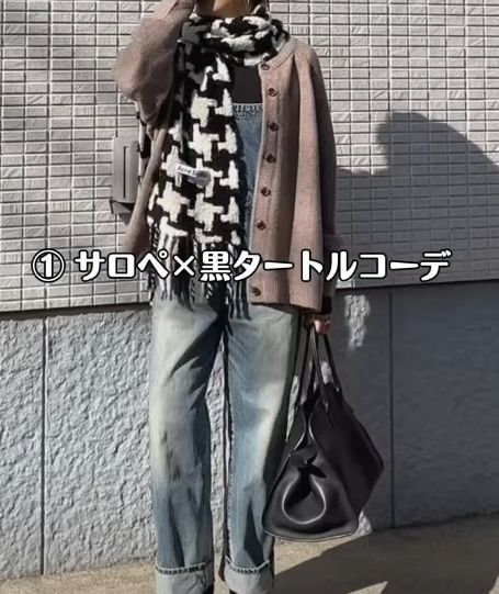 大人が着るのがむずかしいデニムのサロペットも、落ち着いたグレージュのカーディガンをさらりと羽織ることで、奥行きのある洗練された印象にまとまります。足元にはポインテッドトゥのブーツを合わせて、全体をきりっと引き締めるのが大人らしく仕上げるコツです。斜めに配されたボタンのデザインがアクセントになり、シンプルながらも周囲と差がつく、冬のこなれカジュアルが完成します。