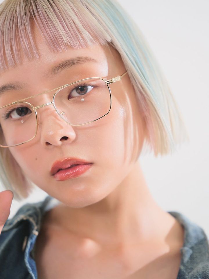 前髪と毛先のライン、面の美しさに見惚れるミニボブに、デザインフルなカラーを加えて圧巻なしゃれ髪に。フルブリーチ後、全体にクリーミーベージュでカラー。表面の中間から毛先にかけてアンブレラ状にシアンブルー、前髪内側にピンクパープルを入れ、前髪のライン感を強調しつつ、動きをプラス。
