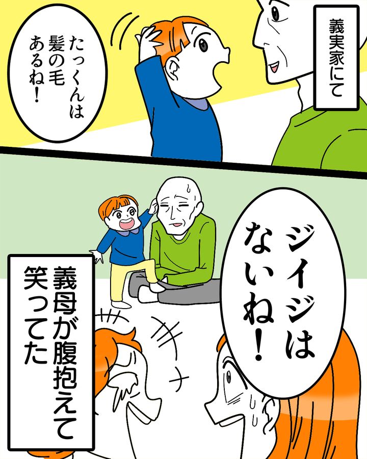 あー、言っちゃった(苦笑)。隣で聞いていたお義母さんは大爆笑、ママは顔面蒼白。「それ言っちゃダメなやつ~」案件です。この状況がよくわかるママ、多いのではないでしょうか。本当、子どもって思ったことを全部口に出しちゃうから、その都度ママはタジタジ。ジイジの心に暗い影が落ちていないことを祈るばかりですね。でもきっと数年後には楽しい思い出になっていますよ。